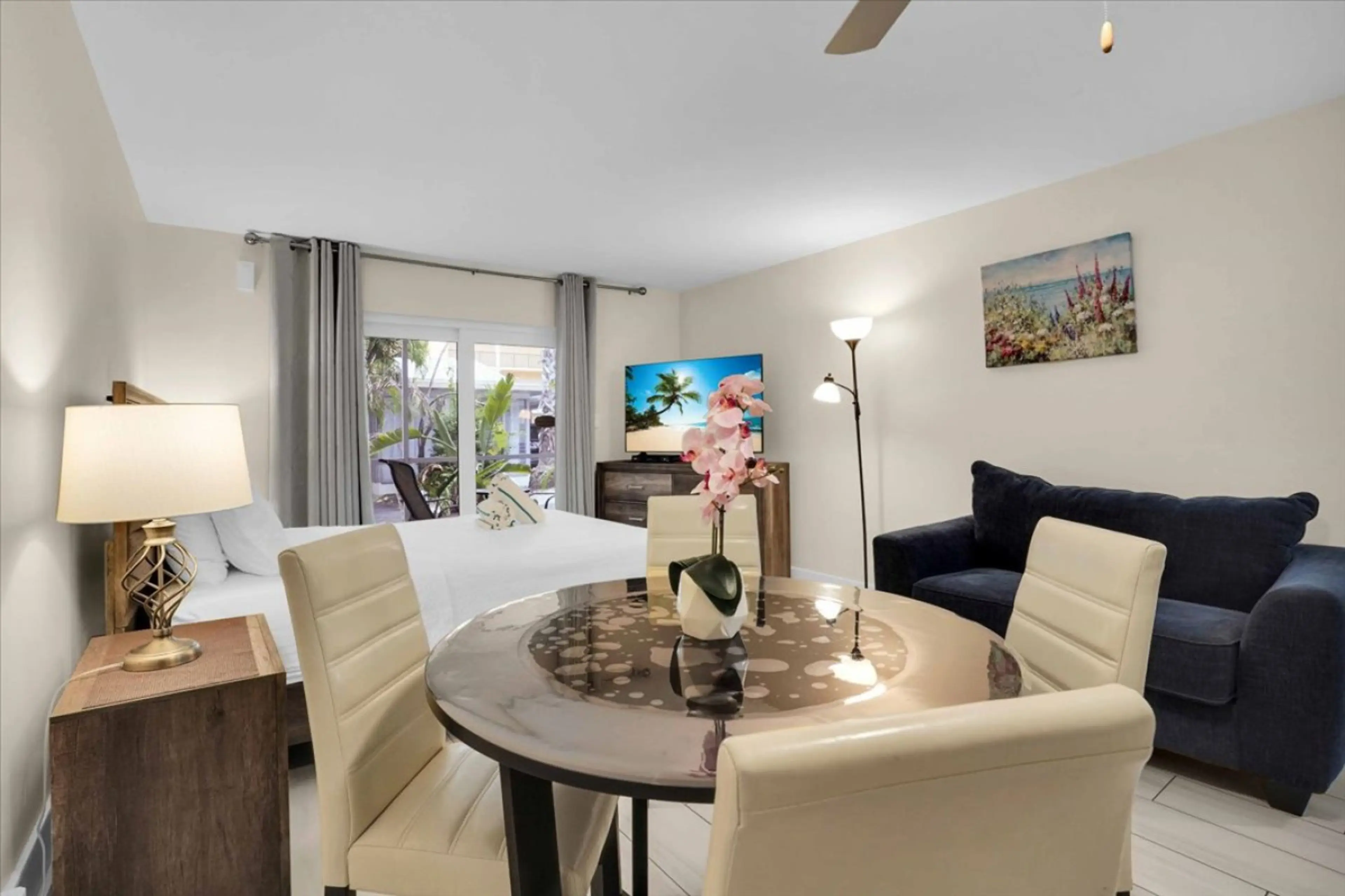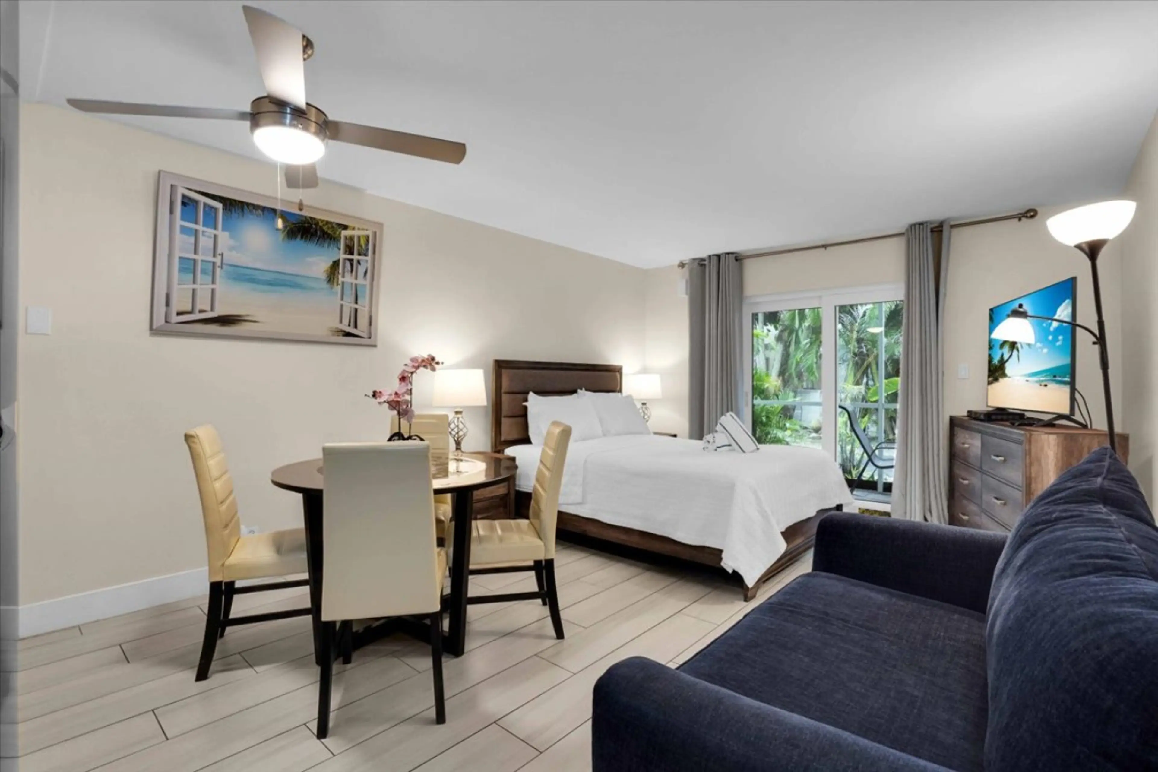 This charming studio for two is perfect for a quiet vacation. Located at the Turtle Crawl Inn Resort in the Garden two-story section, with just a short walk from your door to the beach and pool. Unit # 63 comes with a full kitchen, a Queen bed, and Twin sofa beds. Eating area and a large screened-i...